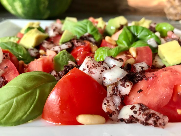 Dans une assiette de service, déposer la tomate, l’avocat, le basilic et les noix de pin. Ajouter les oignons et arroser d’huile d’olive.