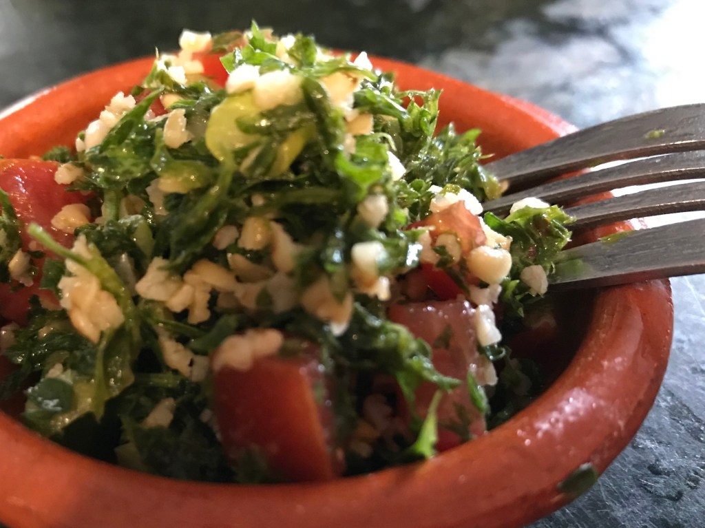 À la maison, tout le monde adore le taboulé. Avec un bon pita frais, on se fait des roulés de hummus avec taboulé et salade de légumineuses. Ça dégoûte partout, mais on s’en fout!!! C’est trop bon!!!