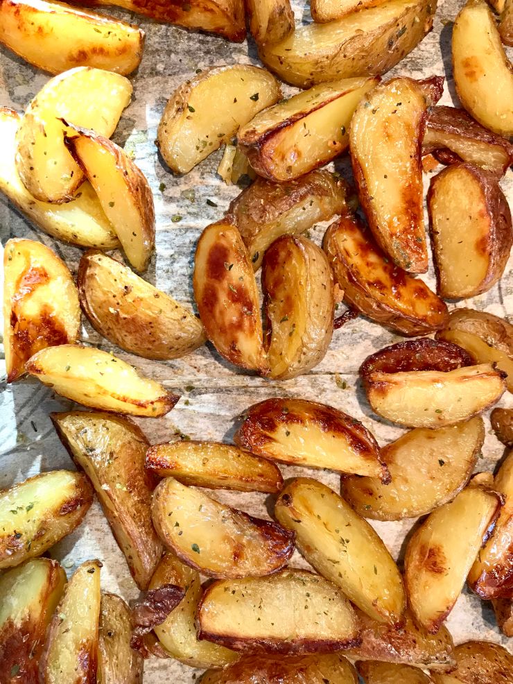 Chauffez le four à 425 degrés. Déposer un papier parchemin sur une grande plaque à cuisson. Ajoutez les pommes de terre, 2 c. à soupe d’huile d’olive et les assaisonnements de votre choix. Sur les patates de la photo, j’ai mis du sel, de l’origan séché ainsi que de l’ail émincé en toute fin de cuisson. Cuire environ 40 minutes, en remuant régulièrement, ou jusqu’à ce que les patates soient rôties à votre goût. La texture est à la limite du… aphrodisiaque.