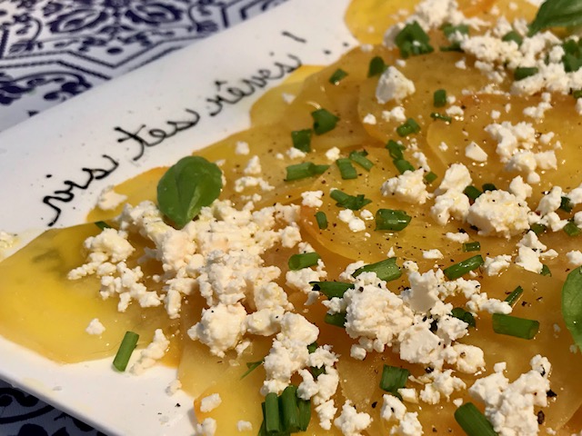 Je n’avais jamais acheté de betteraves jaunes de ma vie. J’arrive chez Adonis et je les aperçois. Elles me font de l’oeil. J’en mets quelques unes dans un sac et je reviens à la maison. Je les ai fait cuire une trentaine de minutes dans l’eau bouillante. Je les ai pelées pour finalement les trancher à la mandoline. Wow!!! La beauté du légume, la couleur éclatante, c’était déjà invitant. Tout simplement, j’ai ajouté du fromage feta et des oignons verts, une touche d’huile et de vinaigre. J’ai salé et poivré généreusement. À refaire!!!