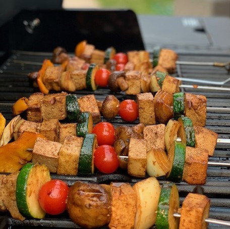 1 bloc de tofu (idéalement de la Soyarie, le paquet rouge) 1 poivron rouge 2 courgettes ½ oignon espagnol ou rouge 12 mini-tomates 12 champignons Pour la marinade: ¼ de tasse de tamari ¼ de tasse d’huile d’olive 2 c. à soupe de vinaigre balsamique 3 gousses d’ail pressées 1 c. à soupe de cari 1 c. à thé de paprika Couper le tofu en cubes et les légumes en gros morceaux. Déposer dans un grand Tupperware et ajouter tous les ingrédients de la marinade. Laisser mariner le plus longtemps possible (préparer idéalement le matin pour le repas du soir) et remuer régulièrement. Confectionner les brochettes, en alternant le tofu et les légumes. J’aime coller les oignons avec le tofu pour donner un peu plus de goût. Rôtir sur le Barbecue à chaleur moyenne une vingtaine de minutes. Les retourner au cours de la cuisson. Badigeonner avec le reste de la marinade. Servir avec du riz ou une salade.
