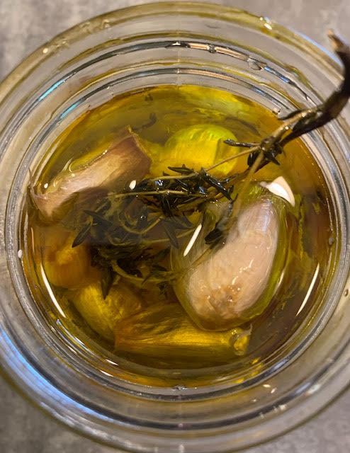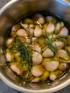 Une belle recette à faire en plein mois d’août alors que l’ail nouveau est très abondant. Donne 3 petits pots Masson de 250 ml. Se conserve plusieurs mois au frigo bien recouvert d’huile. Et se congèle aussi facilement. 50 gousses d’ail 1 tasse d’huile d’olive 1 c. à thé de poivre en grains 2 c. à thé de gros sel 1-2 branches de thym frais 1 branche de romarin frais Dans une petite casserole, déposer les gousses d’ail avec la pelure (Je laisse une fine pelure sur chacune des gousses d’ail). Ajouter le reste des ingrédients. Porter à ébullition, réduire le feu, couvrir et laisser mijoter une cinquantaine de minutes. Empoter. L’odeur et le goût sont sublimes. Vous allez devenir accro!!! J’aime particulièrement utiliser mon ail comme sauce pour mes pizzas. Divin!