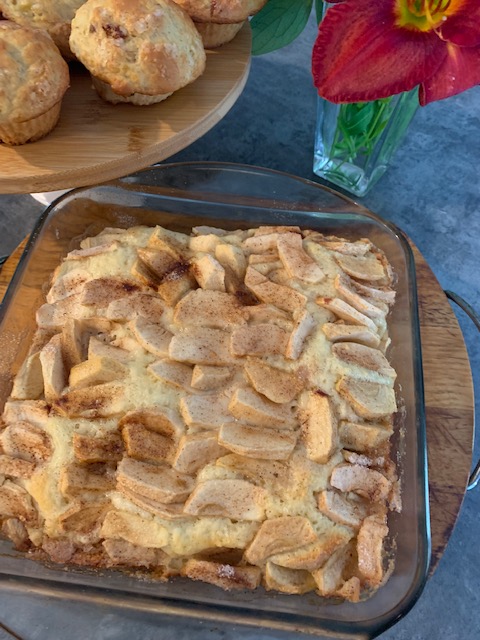 Ce que m’a demandé ma fille la semaine dernière??? Tsé le gâteau avec les pommes en haut!!! Puisque c’est le temps des pommes… On se gâte!!! Pour la pâte: 1 ⅓ de tasse de farine ½ tasse de sucre 1 c. à soupe de poudre à pâte 1 pincée de sel ¼ de tasse de beurre 1 oeuf, battu ¾ de tasse de lait Pour la garniture: 4 pommes pelées et tranchées 2 c. à soupe de sucre ½ c. à thé de cannelle 1 bonne pincée de muscade Préchauffer le four à 350 degrés. Dans un bol, mélanger la farine, le sucre, la poudre à pâte et le sel. Incorporer le beurre en le coupant finement au couteau. Ajouter l'œuf battu et le lait en fouettant à la fourchette. La texture de la pâte doit rester collante. Déposer dans un moule carré légèrement huilé. Ajouter les pommes et le mélange de sucre, muscade et cannelle. Cuire au four une quarantaine de minutes.