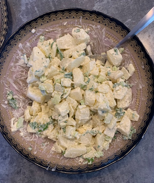 Cochon, cochon, cochon!!! C’est la recette sur laquelle mes enfants se garrochent comme s' ils n'avaient pas mangé depuis des lustres!!! Ma mère me dit toujours que plus les patates sont vieilles, meilleure sera la salade de patates!!! 4 tasses de patates cuites, coupées en dés 1 ½ tasse de céleri, coupé en dés ¼ de tasse d’oignon, haché très finement 2 c. à soupe de persil, émincé Pour la sauce: ¾ de tasse de mayonnaise Hellmann’s 1 c. à soupe de vinaigre blanc 1 c. à thé de moutarde préparée 2 c. à thé de sel Poivre au goût Déposer les ingrédients de la salade dans un grand bol. Préparer la sauce dans un petit bol. Verser la moitié de la sauce sur les patates encore chaudes. Réfrigérer au moins une heure. Verser le reste de la sauce et assaisonner au goût. Décorer de persil. Pour pimper la recette, j’aime aussi ajouter de la roquette, des petits ajouter des olives et des œufs durs. On peut doubler ou même tripler la recette, mais pas la quantité de sel. Goûter pour ajuster l’assaisonnement.