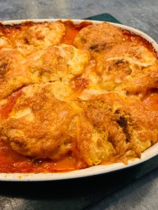 Préparation au saumon: 2 c. à soupe de beurre 1 petit oignon, haché ½ tasse de courgette, en dés 1 gousse d’ail, émincée 2 c. à soupe de farine 1 ½ tasse de lait 2 tasses de tomates en boîte 1 grosse boîte de saumon de 418g Pour la pâte: 1 ½ tasse de farine 1 c. à soupe de poudre à pâte ¼ de tasse de beurre ramolli 1 tasse de lait ½ tasse de fromage cheddar, râpé Préchauffer le four à 400 degrés. Dans une grande poêle, faire fondre le beurre de la préparation au saumon. Faire revenir l’oignon, l’ail et la courgette 3 à 5 minutes à feu moyen. Ajouter la farine et une pincée de sel. Délayer avec le lait et laisser épaissir. Incorporer les tomates et le saumon. Bien mélanger. Poursuivre la cuisson 1 à 2 minutes. Déposer dans un plat rectangulaire allant au four. Dans un bol, mélanger les ingrédients de la pâte. Avec une cuillère, former des monticules de pâte sur la préparation de saumon. Saupoudrer le fromage cheddar sur les monticules. Cuire au four 25 minutes.