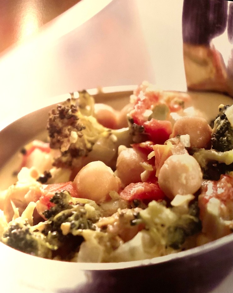 Incorporer les tomates, le lait de coco, l’eau et les pois chiches. Laisser mijoter 7 minutes.