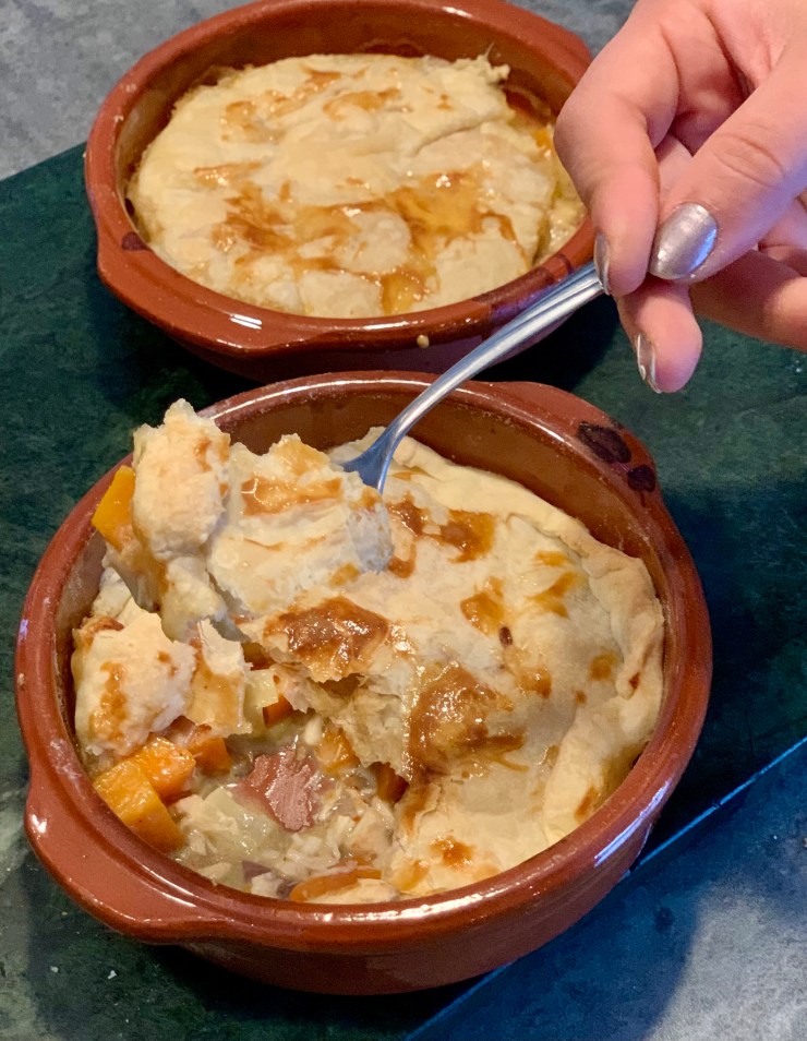 Déposer le mélange dans des plats individuels ou dans un grand plat rectangulaire allant au four. Ajouter la pâte feuilletée que vous pouvez badigeonner de jaune d’oeuf.